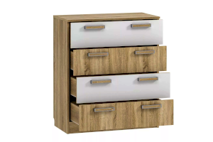 Комод «Фанк» -  идеально подходит для обустройства комнаты подростка. Светлые тона мебели, выдержанный стиль прекрасно смотрятся в любом интерьере. Четыре удобных выдвижных ящика – это огромный объем  для хранения белья, предметов одежды и аксессуаров. Выдвижные ящики оснащены шариковыми направляющими полного выдвижения, равномерно распределяют вес содержимого и обеспечивают плавный бесшумный ход ящика. Комод отлично сочетается с другими моделями коллекции «Фанк».