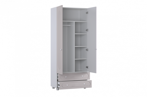 Слева внутри шкафа расположена штанга для плечиков, предназначенная для хранения одежды на вешалках. Правая часть оборудована полками, которые подойдут для аккуратного размещения сложенной одежды, коробок или аксессуаров. В нижней части предусмотрены два вместительных выкатных ящика для хранения, обеспечивающих дополнительное место для вещей повседневного использования.