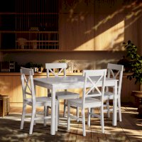 Стильный обеденный комплект Хадсон из Дельфийской коллекции идеально дополнит интерьер вашей кухни или столовой. Обеденная группа будет отлично смотреться в гостиной, кухни или столовой создавая в комнате атмосферу спокойствия и комфорта. Каркас стола классической прямоугольной формы и основание стульев выполнены из массива тополя - прочной и долговечной древесины. Столешница изготовлена из МДФ, она не требует специального ухода, не деформируется при изменении температуры и попадания влаги. Стол и стулья в белом цвете (white) будут стильно смотреться в вашем интерьере.