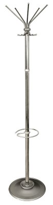 Вешалка напольная на 5 крючков. Утяжеленное двойное основание. Оснащена подставкой для зонтов. Крючки и основание вешалки напольной выполнены из  серого металлика.