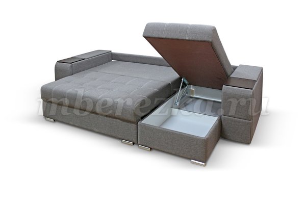 Угловой диван со столиком и выдвижными ящиками в подлокотниках «РИФ» завоевал среди покупателей большую популярность. Такая мебель значительно экономит пространство в помещении и, несомненно, делает отдых на диване комфортнее, ведь буквально под рукой есть раскладной столик в подлокотнике, на который можно поставить бокал, положить книгу или журнал, удобен при работе с ноутбуком. Другой подлокотник оборудован выдвижными полочками для хранения различных вещей. Большой ящик для белья внутри дивана, простой, и надежный механизм трансформации «тик-так» подтверждают функциональность этой модели. Блок независимых пружин, прошивка на сиденье – гарантия длительной эксплуатации дивана.
